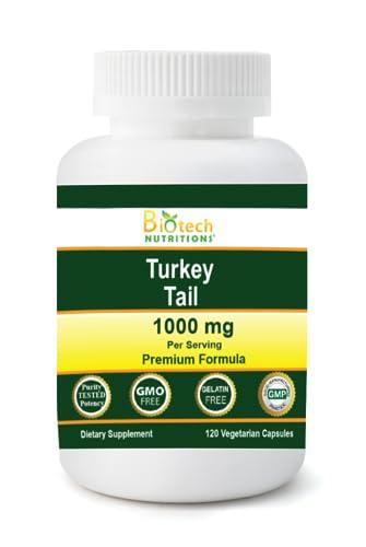 Biotech Nutritions Turkey Tail 1000 mg per serving 120 vegetable capsules. Made in USA. Non-gmo & Vegan Turkey Tail mushroom.