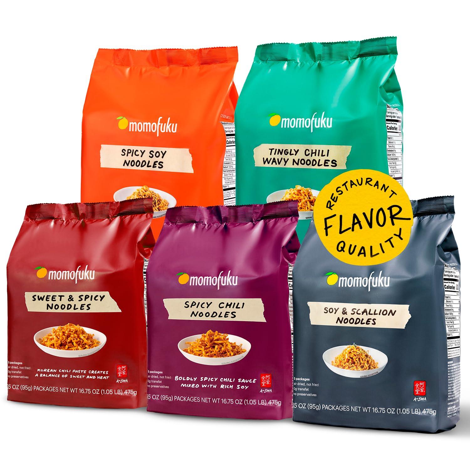 - NEXT-GEN NOODLES | Momofuku Noodles from David Chang are made from simple, wholesome ingredients. Each pack contains 5 individually wrapped servings of each flavor: Soy & Scallion, Spicy Soy, Tingly Chili Wavy, Sweet & Spicy and Spicy Chili totaling to 25 meals.