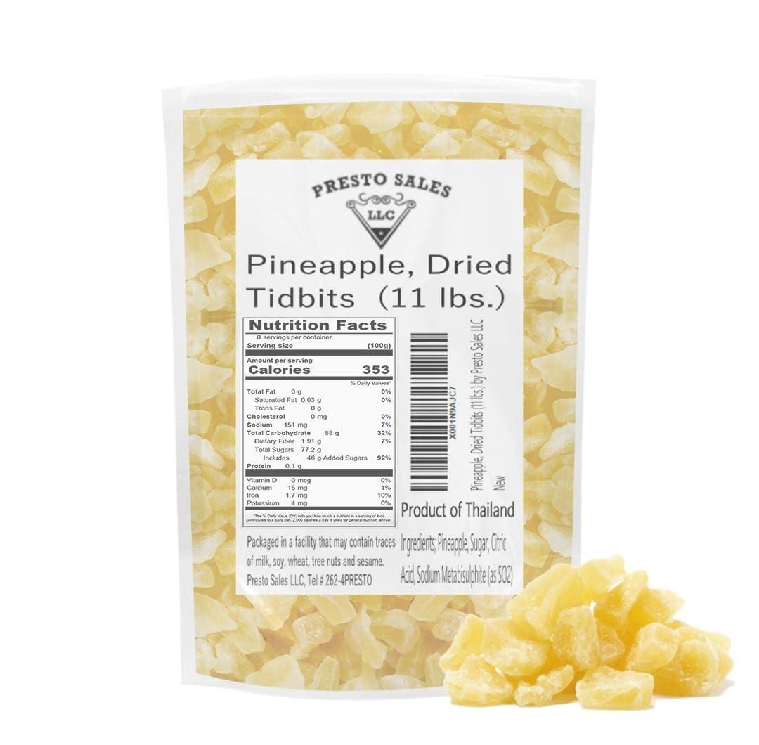 - VIBRANCY: Presto Sales selects heavenly pineapples at their peak of flavor. They are then diced and tenderly dried, creating perfect, chewy, delectable, sweet fruits. Relish in the fruity aroma and vibrant taste.